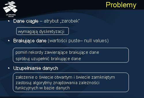 Drugim problemem są brakujące dane w bazie danych czyli wartości puste (null values), w tym wypadku przyjmujemy dwie strategie. Albo pomijamy rekordy zawierające brakujące dane, albo próbujemy uzupełnić brakujące dane.