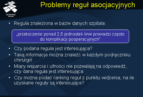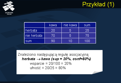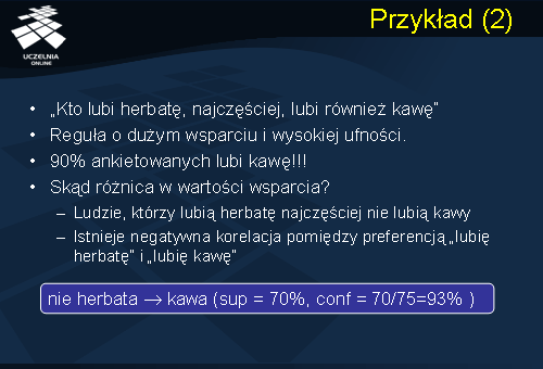 Z podanej reguły możemy wnioskować: „Kto lubi herbatę, najczęściej, lubi również kawę”. Otrzymana reguła ma duże wsparcie oraz wysoką ufność. Jednak analizując przedstawioną na poprzednim slajdzie tabelę, dochodzimy do następującej konkluzji: przedstawiona reguła posiada wsparcie 20%, jest to o tyle zaskakujące, że aż 90% ankietowanych deklaruje się jako zwolennicy kawy. Skąd różnica wartości wsparcia reguły na poziomie 20% i deklarowanej preferencji do kawy 90% ankietowanych. Jeżeli przyjrzymy się tabeli ponownie, dojdziemy do wniosku, że ludzie, którzy lubią herbatę najczęściej nie lubią kawy. Istnieje negatywna korelacja pomiędzy preferencją „lubię herbatę” i „lubię kawę”. Gdybyśmy wygenerowali regułę przeciwną: ‘Ci, którzy nie lubią herbaty, ale lubią kawę” ma wsparcie 70% oraz ufność 93%.