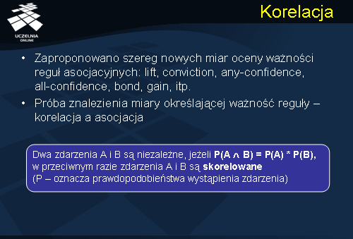 Miara Lift jest miarą korelacji pomiędzy poprzednikiem i następnikiem reguły asocjacyjnej. Jeżeli wartość miary Lift wynosi 1 oznacza, że zdarzenia reprezentujące poprzednik reguły i następnik reguły są niezależne. Jeżeli wartość miary Lift < 1 oznacza iż zdarzenia reprezentujące poprzednik i następnik reguły są skorelowane negatywnie, wówczas należałoby rozważać regułę przeciwną. Jeżeli wartość miary Lift > 1 oznacza to, że zdarzenia reprezentujące poprzednik i następnik reguły są skorelowane pozytywnie. Wracając do przykładu ‘kto lubi herbatę lubi również kawę’ wartość miary Lift wynosi 0.89, stąd wiemy, że zdarzenia są skorelowane negatywnie, skąd możemy wnioskować, że prawdopodobnie reguła przeciwna ‘Kto nie lubi herbaty najczęściej lubi kawę”, będzie regułą asocjacyjną o większym wsparciu i większej ufności niż oryginalna rozpatrywana reguła.
