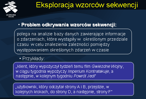 ‘Klient, który wypożyczył tydzień temu film pod tytułem Gwiezdne wojny, w ciągu tygodnia wypożyczy film pod tytułem Imperium kontratakuje, a następnie, w ciągu kolejnego tygodnia, wypożyczy film po tytułem Powrót Jedi’. Zauważmy, że zdarzenia wchodzące w skład wzorca sekwencji nie muszą występować bezpośrednio jedno po drugim - mogą być przedzielone wystąpieniem innych zdarzeń. W odniesieniu do przedstawionego powyżej wzorca sekwencji, oznacza to, że klient, pomiędzy wypożyczeniem filmu Imperium kontratakuje a Powrót Jedi, wypożycza zwykle jeszcze inny film, ale podana sekwencja opisuje typowe zachowanie większości klientów wypożyczalni.