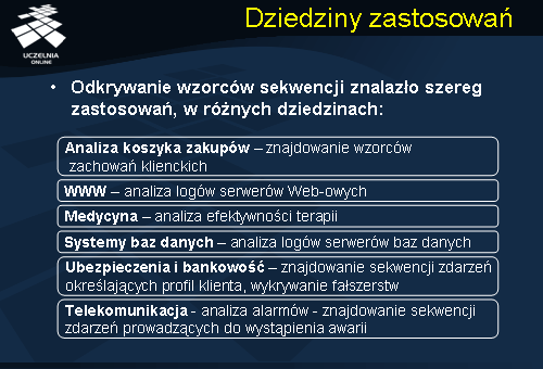 Metoda odkrywania wzorców sekwencji znalazła zastosowanie w wielu dziedzinach: analiza koszyka zakupów, telekomunikacja, medycyna, ubezpieczenia i bankowość, serwery WWW, itd. W przypadku analizy koszyka zakupów, metodę odkrywania wzorców sekwencji stosuje się w celu znalezienia typowych wzorców zachowań klientów w czasie. Dotyczy to handlu hurtowego lub półhurtowego, gdy potrafimy zidentyfikować pojedynczego klienta i jego koszyk zakupów. W takim przypadku, z każdym rekordem opisującym zakupy pojedynczego klienta jest związana, dodatkowo, informacja o kliencie (identyfikator klienta) i o dacie zakupów (etykieta czasowa rekordu). Zbiór wszystkich rekordów w bazie danych opisujących zakupy danego klienta, uporządkowany zgodnie z wartościami etykiet czasowych tych rekordów, nazywamy sekwencją klienta i stanowi ona opis zachowania konsumenckiego tego klienta w czasie. Analizując sekwencje klientów w bazie danych możemy znaleźć typową sekwencję zakupów i, na tej podstawie, przewidywać przyszłe zachowania klientów: „klient, który miesiąc temu zakupił dużą partię cegieł o rozmiarze 25 cm, w ciągu tygodnia zakupi jeszcze, dodatkowo, partię cegieł o rozmiarze 11 cm”. Metodę odkrywania wzorców sekwencji stosuje się w analizie kataklizmów (trzęsienia ziemi, huragany, erupcje wulkanów) w celu określenia typowej sekwencji zdarzeń prowadzących do wystąpienia kataklizmu. W telekomunikacji metodę odkrywania wzorców sekwencji stosuje się do analizy sygnałów alarmowych urządzeń sieciowych w celu znalezienia zależności pomiędzy wystąpieniami tych sygnałów i określenia na tej podstawie źródła uszkodzenia w sieci. W ostatnim czasie operatorzy telefonii komórkowej wykorzystują metody odkrywania wzorców sekwencji do określania wzorców zachowań klientów, którzy przenoszą się do innych operatorów. Metody te są również szeroko stosowane w bankowości i ubezpieczeniach do analizy zachowań klientów i wykrywania oszustw ubezpieczeniowych. Ważnym obszarem zastosowań metod odkrywania wzorców sekwencji jest medycyna, gdzie metody te, przykładowo, wykorzystuje się do (1) określania efektywności terapii leczenia, (2) w diagnostyce medycznej do określania zależności pomiędzy występowaniem określonych symptomów chorobowych a jednostkami chorobowymi, wreszcie, (3) do analizy kosztów leczenia i wykrywania fałszerstw medycznych (żądania zwrotu nienależnych kosztów leczenia, fałszywych recept, itp.). Wreszcie, metody te znalazły szerokie zastosowanie do analizy efektywności i organizacji serwerów Web. Odkrywając wzorce sekwencji dostępu do stron WWW, przez eksplorację logu serwera WWW, można poprawić organizację logiczną serwera, zreorganizować sposób nawigacji po stronach WWW (poprawić i uprościć strukturę połączeń pomiędzy skorelowanymi stronami), czy też poprawić sposób prezentacji reklam (tzw. adaptatywne serwery WWW) dynamicznie dostosowując prezentację reklam do określonych grup użytkowników.