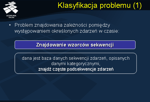 W zakresie odkrywania wzorców sekwencji możemy de facto wyróżnić trzy oddzielne problemy. Pierwszym problemem jest znajdowanie zależności pomiędzy występowaniem określonych zdarzeń w czasie czyli „znajdowanie wzorców sekwencji”. Problem ten możemy sformułować w następujący sposób: ‘Mamy daną bazę danych zawierającą sekwencję zdarzeń, które są opisane danymi kategorycznymi – znajdź wszystkie częste podsekwencje zdarzeń’.