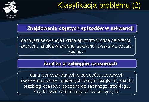 Kolejny problem to problem znajdowania częstych epizodów sekwencji. Problem ten możemy scharakteryzować następująco: ‘Dana jest sekwencja i pewna klasa epizodów (klasa sekwencji zdarzeń), znajdź w zadanej sekwencji wszystkie częste epizody’. Ostatni problem reprezentuje problem analizy przebiegów czasowych. Problem ten możemy określić w następujący sposób: ‘Dana jest baza danych przebiegów czasowych (sekwencji zdarzeń opisanych danymi ciągłymi), znajdź przebiegi czasowe podobne do zadanego przebiegu, znajdź cykle w przebiegach czasowych, itp.’