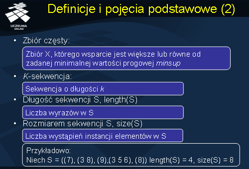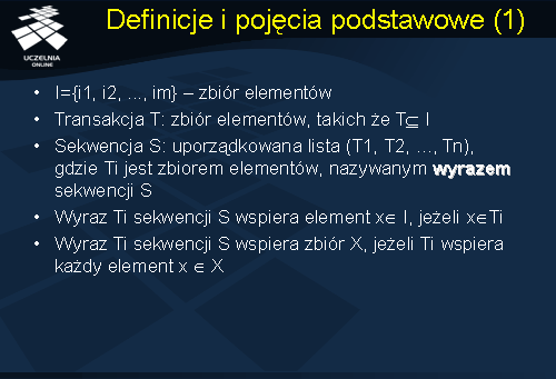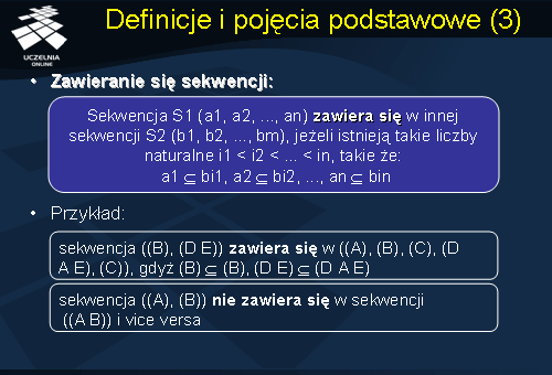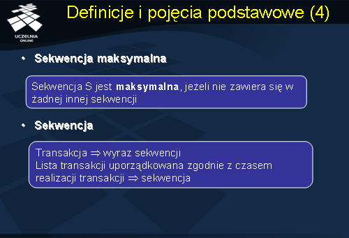 W dalszej części wykładu skoncentrujemy się na pierwszym z wymienionych problemów, mianowicie na problemie znajdowania wzorców sekwencji. Aby móc dalej zagłębić się w problematykę odkrywania wzorców sekwencji, zapoznajmy się z podstawowymi pojęciami i definicjami jakimi będziemy się posługiwać w dalszej części wykładu.