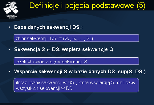 W dalszej części wykładu będziemy rozważać bazę danych sekwencji DS nazywać będziemy zbiór sekwencji S, takich że DS = (S1, S2, ..., Sn). Mówimy, że sekwencja S należąca do bazy danych sekwencji DS, wspiera sekwencję Q, jeżeli Q zawiera się w sekwencji S.