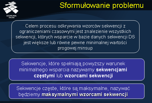 Możemy obecnie przejść do oficjalnego sformułowania problemu odkrywania wzorców sekwencji. Celem procesu odkrywania wzorców sekwencji jest znalezienie wszystkich sekwencji, których wsparcie w bazie danych sekwencji DS przekracza pewną zadaną wartość minimalną, oznaczoną minsup. Sekwencje, które spełniają powyższy warunek minimalnego wsparcia, nazywamy sekwencjami częstymi lub wzorcami sekwencji. Sekwencje częste, które są maksymalne, nazywać będziemy maksymalnymi wzorcami sekwencji.