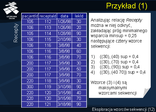 receptach (receptaId), dacie wypisania recepty (data) oraz zapisanych lekach (lekId). Interpretacja tabeli jest następująca, rozważmy pierwszy rekord przedstawiony w tabeli. Rekord ten przedstawia sytuację, że 26 stycznia 1998 roku pacjent o identyfikatorze 105 otrzymał receptę 112 na lek o identyfikatorze 30. Kilka dni później, czyli 28 stycznia 1998 roku ten sam pacjent o identyfikatorze 105 otrzymał kolejną receptę 114 na lek o identyfikatorze 90. Przykładowo pacjent o identyfikatorze 200 otrzymał recepty o identyfikatorze 117 w dniu 3/9/98 na następujące leki: lek o identyfikatorze 30, lek o identyfikatorze 50 oraz lek o identyfikatorze 70. Przedstawioną bazę danych można przedstawić w postaci bazy danych sekwencji, w której kolejność występowania zdarzeń jest reprezentowana poprzez uporządkowanie wyrazów sekwencji. W tym przypadku zdarzeniem jest wypisanie recepty pojedynczemu pacjentowi na określony zbiór leków. Analizując bazę danych sekwencji można w niej odkryć, zakładając próg minimalnego wsparcia minsup = 0.25, następujące cztery wzorce sekwencji:
