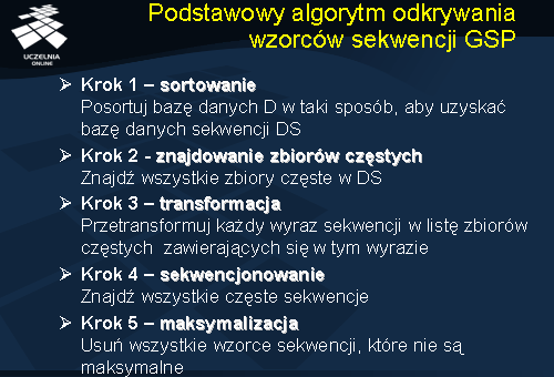 Na wykładzie zapoznamy się z problemem odkrywania wzorców sekwencji. Rozpoczniemy od wprowadzenia oraz sformułowania problemu. Następnie wprowadzimy szereg nowych definicji, z którymi będziemy się posługiwać w eksploracji wzorców sekwencji. Przedstawimy poszczególne kroki algorytmu GSP oraz zilustrujemy jego działanie na przykładzie.