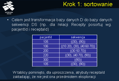 Obecnie przejdziemy do omówienia poszczególnych kroków podstawowego algorytmu odkrywania wzorców sekwencji. Rozpoczniemy od kroku pierwszego – czyli kroku sortowania. Celem tego kroku jest transformacja oryginalnej bazy danych D do bazy danych sekwencji DS. Transformacja ta wymaga posortowania bazy danych D w taki sposób, aby można było ją przetransformować do postaci bazy danych sekwencji DS. Sposób sortowania zależy od charakterystyki bazy danych D. W naszym przykładzie transformacja wymaga posortowania bazy danych D według atrybutów Pacjent_id (w tablicy pominięto, dla uproszczenia, atrybut receptaId zakładając, że nie jest ona przedmiotem eksploracji). Następnie, rekordy reprezentujące danego pacjenta, uporządkowane według rosnących wartości atrybutu data, były transformowane do postaci sekwencji wyrazów. Wynikiem tego kroku jest baza danych sekwencji DS. przedstawiona na slajdzie.