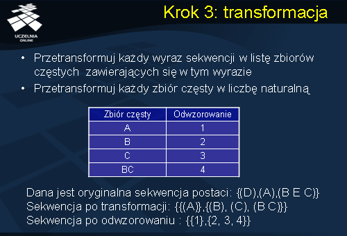 Kolejnym krokiem algorytmu jest krok transformacji. Celem kroku transformacji jest zastąpienie każdego wyrazu T sekwencji S w uporządkowaną listę zbiorów częstych zawierających się w wyrazie T. W wyniku tej transformacji są usuwane z wyrazu T wszystkie te elementy, które nie są częste i które, tym samym, nie mogą wystąpić we wzorcach sekwencji. Jeżeli sekwencja nie zawiera żadnych zbiorów częstych, to nie wchodzi ona do transformowanej bazy danych. Brana jest ona jednak pod uwagę przy obliczaniu wsparcia wzorca sekwencji. Stąd, po zakończeniu kroku transformacji, każda sekwencja jest reprezentowana w bazie danych sekwencji DS w postaci uporządkowanej listy wyrazów będących zbiorami częstymi. Stąd dla naszego przykładu musimy wykonać następujące kroki: Przetransformuj każdy wyraz sekwencji w listę zbiorów częstych zawierających się w tym wyrazie, następnie przetransformuj każdy zbiór częsty w liczbę naturalną. Ma to na celu uproszczenie obliczeń. Dla ilustracji tego kroku rozważmy następujący przykład umieszczony na slajdzie. Załóżmy, że dane są następujące zbiory częste {{A},{B},{C},{BC}} znalezione w bazie sekwencji DS. Załóżmy, że przyjęliśmy następujące odwzorowanie – zbiór częsty {A} jest reprezentowany przez liczbę naturalną 1, zbiór częsty {B} jest reprezentowany przez liczbę naturalną 2, zbiór częsty {C} jest reprezentowany przez liczbę naturalną 3 oraz zbiór częsty {BC} reprezentowany przez liczbę 4. Dla podanej oryginalnej sekwencji postaci: {{D},{A},{(B E C)}}. Zauważmy, że wyraz pierwszy tej sekwencji zawiera element D, który nie jest zbiorem częstym – dlatego zostanie usunięty z naszej sekwencji. Kolejny wyraz A jest zbiorem częstym, pozostaje w naszej sekwencji, itd. W wyniku transformacji otrzymamy następującą sekwencję dwuwyrazową: {{(A)}, {(B), (C), (B C)}} oraz sekwencja po odwzorowaniu: {{1},{2, 3, 4}}.