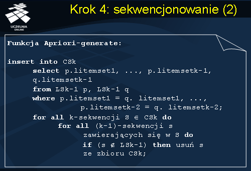 Kolejnym krokiem algorytmu jest krok sekwencjonowania. Celem kroku sekwencjonowania jest znalezienie wszystkich sekwencji częstych. Punktem wyjścia procedury przedstawionej na slajdzie implementującej krok 4 są wszystkie sekwencje częste o długości 1. Sekwencje te są wynikiem działania kroku drugiego. Następnie realizowana jest pętla for, rozpoczynamy od k=2. Generowane są wszystkie sekwencje kandydujące o długości 2 w oparciu o zbiór wszystkich sekwencji częstych o długości 1. Do generowania sekwencji kandydujących o długości 2 wykorzystywana jest funkcja Apriori-generate(). Następnie dla każdej sekwencji S należącej do bazy danych sekwencji DS, zwiększamy licznik wszystkich sekwencji kandydujących należących do CS2, zawierających się w sekwencji S. Pętla jest powtarzana tak długo jak długo zbiór sekwencji częstych o długości k jest różny od zbioru pustego. Wynikiem działania tej procedury jest zbiór wszystkich sekwencji częstych o długości 1,2,3,…,k.
