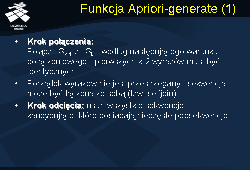 W jaki sposób jest realizowany krok połączenia funkcji Apriori_generate()? Otóż łączymy dwie sekwencje częste o długości k-1 w celu uzyskania sekwencji kandydującej o długości k, według następującego warunku połączeniowego: można połączyć dwie sekwencje częste o długości k-1 jeżeli pierwszych k-2 wyrazów obu sekwencji jest identyczny. Zwróćmy uwagę, że porządek wyrazów nie jest przestrzegany i sekwencja może być łączona ze sobą (tzw. selfjoin). Krok odcięcia wygląda podobnie ja w przypadku funkcji Apriori_gen() - gdzie zostają usunięte wszystkie sekwencje kandydujące, które posiadają nieczęste podsekwencje.