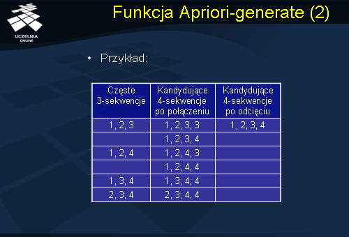 Przykład przedstawiony na slajdzie ilustruje działanie funkcji Apriori-generate(), która w dwóch krokach (połączenia i odcięcia) generuje kandydatów w oparciu o sekwencje częste. Dany jest zbiór częstych sekwencji o długości 3 przedstawiony na slajdzie, są to następujące sekwencje: {1,2,3},{1,2,4},{1,3,4},{2,3,4}. W wyniku pierwszego kroku działania funkcji Apriori_generate() otrzymujemy zbiór sekwencji kandydujących o długości 4 przedstawiony na slajdzie. Zauważmy, że sekwencję częstą o długości 3 - {1,2,3} możemy połączyć ze sobą, uzyskamy wówczas sekwencję kandydującą o długości 4 - {1,2,3,3} oraz sekwencję {1,2,3} możemy połączyć z sekwencją częstą o długości 3 z sekwencją {1,2,4}. Uzyskamy wówczas sekwencję kandydującą o długości 4 postaci {1,2,3,4}. Następnie sekwencję częstą {1,2,4} łączymy z sekwencją {1,2,3} i uzyskujemy sekwencję kandydująca o długości 4 postaci {1,2,4,3}. Sekwencję częstą {1,2,4} możemy połączyć ze sobą i wówczas otrzymamy sekwencję kandydująca postaci {1,2,4,4}. Sekwencję {1,3,4} możemy połączyć tylko ze sobą i wówczas otrzymamy sekwencję kandydująca postaci o długości 4 {1,3,4,4}, podobnie w przypadku sekwencji częstej {2,3,4} łączymy ją ze sobą i otrzymujemy sekwencję kandydującą o długości 4 postaci {2,3,4,4}. W drugim kroku, funkcja usuwa wszystkie sekwencje kandydujące, o długości 4, które posiadają nieczęste podsekwencje. W wyniku czego otrzymujemy 1 sekwencję kandydującą o długości 4 postaci {1,2,3,4}.