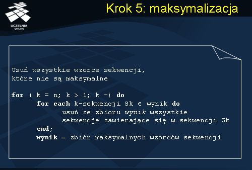 Prezentowany slajd przedstawia ostatni krok algorytmu odkrywania wzorców sekwencji – kroku maksymalizacji. Celem kroku maksymalizacji, który jest krokiem opcjonalnym, jest znalezienie w zbiorze wszystkich wzorców sekwencji, tych wzorców sekwencji, które są maksymalne. Dany jest zbiór wszystkich wzorców sekwencji S znalezionych w kroku sekwencjonowania. Następujący algorytm usuwa ze zbioru S wszystkie sekwencje, które nie są maksymalne (n oznacza długość najdłuższej sekwencji ze zbioru S). W wyniku tego kroku otrzymujemy wszystkie maksymalne wzorce sekwencji.