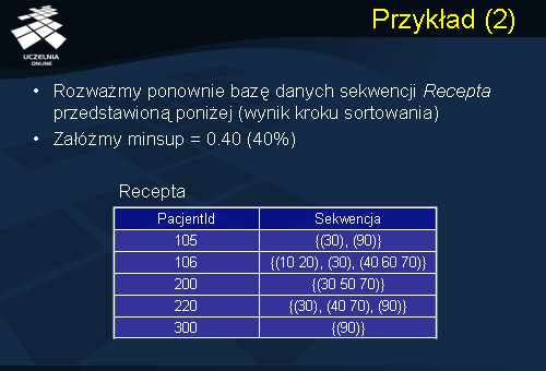 Dla ilustracji działania algorytmu odkrywania wzorców sekwencji rozważmy prosty przykład przedstawiony na kolejnych slajdach. Przykład odnosi się do bazy danych sekwencji Recepta, którą analizowaliśmy wcześniej (slajd Przykład (1)). Jak pamiętamy pierwszym krokiem algorytmu odkrywania wzorców sekwencji jest krok sortowania czyli transformacja oryginalnej bazy danych do bazy danych sekwencji. Wynikiem tego kroku jest baza danych sekwencji Recepta umieszczona na powyższym slajdzie. Zakładamy minimalny próg wsparcia = 40%.
