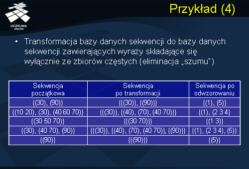 Następnie dokonujemy transformacji bazy danych sekwencji do bazy danych sekwencji zawierających wyrazy składające się wyłącznie ze zbiorów częstych. W ten sposób usuwane są wszystkie te elementy, które nie są częste i tym samym, nie mogą wystąpić we wzorcach sekwencji. Jak powiedzieliśmy wcześniej, jeżeli sekwencja nie zawiera żadnych zbiorów częstych, to nie wchodzi ona do transformacji bazy danych. Brana jest ona jednak pod uwagę przy obliczaniu wsparcia wzorca sekwencji. Stąd, po zakończeniu kroku transformacji, każda sekwencja jest reprezentowana w bazie danych sekwencji DS w postaci uporządkowanej listy wyrazów z których każdy jest listą wyrazów będących zbiorami częstymi. Rozważmy przykład przedstawiony na slajdzie. Zacznijmy od sekwencji początkowej {(30),(90)}. Zauważmy, że pierwszy wyraz, który składa się ze zbioru częstego {30} nie zawiera elementów, które nie są częste zatem wyraz ten nie podlega transformacji i przechodzi do Sekwencji po transformacji. Podobnie z wyrazem drugim {90}, w konsekwencji sekwencja po transformacji ma postać {(30),(90)}, po odwzorowaniu {(1),(5)}. Rozważmy druga sekwencję trzywyrazową, która ma postać{(10 20),(30),(40 60 70)}. Pierwszy wyraz składa się z elementów które nie są częste, zarówno element {10} jak i {20} nie jest elementem częstym. Zatem usuwamy pierwszy wyraz sekwencji. Drugi wyraz jest zbiorem częstym {30}. Trzeci wyraz zawiera zbiór kilku elementów, element {60} nie jest częsty dlatego zostaje usunięty. Pozostają elementy {(40 70)}, zauważmy, że element {40},{70} oraz {(40 70)} są zbiorami częstymi. Stąd, ten wyraz sekwencji początkowej jest transformowany do listy zbiorów częstych następującej postaci {(30),(40),(70),(40 70)}. Po odwzorowaniu otrzymujemy sekwencję po odwzorowaniu {(1),(2,3,4)}. Podobnie postępujemy z pozostałymi sekwencjami.