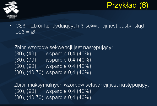 Następnie możemy wykonać ostatni krok algorytmu, który jest krokiem opcjonalnym czyli krok maksymalizacji. W otrzymanym zbiorze częstych wzorców sekwencji znajdujemy te wzorce sekwencji, które są maksymalne. Łatwo zauważyć, że sekwencja {(30),(40)} oraz sekwencja {(30),(70)} nie są sekwencjami maksymalnymi gdyż zawierają się w sekwencji {(30)(40 70)}. Ostateczny zbiór maksymalnych wzorców sekwencji dla zadanego progu minsup=25% składa się z dwóch wzorców: