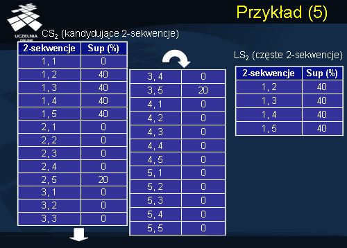 Następnie generowane są sekwencje kandydujące o długości 2 w oparciu o zbiór sekwencji częstych o długości 1. Zauważmy, że zbiór wszystkich sekwencji kandydujących o długości 2 jest zbiorem wszystkich możliwych kombinacji zbioru sekwencji o długości 1. Zatem mamy sekwencję {(1),(1)},{(1),(2)},{(1),(3)} itd. Następnie dla każdej sekwencji kandydującej o długości 2 obliczamy jej wsparcie. Wszystkie sekwencje kandydujące, których wsparcie nie spełnia progu minimalnego wsparcia są eliminowane. W wyniku kroku drugiego otrzymujemy zbiór sekwencji częstych o długości dwa przedstawionych na slajdzie. Zbiór ten składa się z następujących sekwencji {(1),(2)},{(1),(3)},{(1),(4)}{(1),(5)}. Wsparcie wszystkich tych sekwencji wynosi 40%.