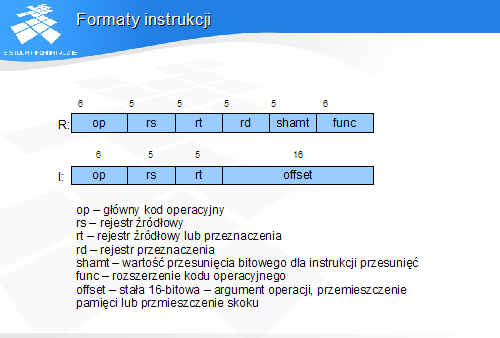 Modelowy procesor ma możliwość wykonywania instrukcji MIPS w dwóch spośród trzech formatów – R oraz I. W obu formatach występują pola głównego kodu operacyjnego i dwa numery rejestrów. Pozostała część słowa instrukcji jest różna dla obu formatów.