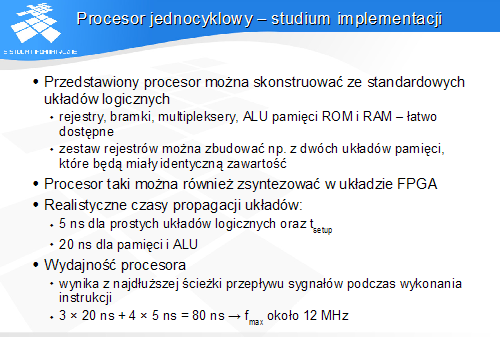 przyjmując parametry analogiczne jak dla modelu procesora jedocyklowego: 20 ns + 3 x 5 ns = 35 ns → fmax około 30 MHz