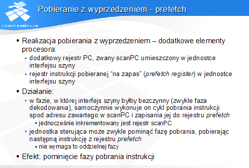 w fazie, w której interfejs szyny byłby bezczynny (zwykle faza dekodowania), samoczynnie wykonuje on cykl pobrania instrukcji spod adresu zawartego w scanPC i zapisania jej do rejestru prefetch