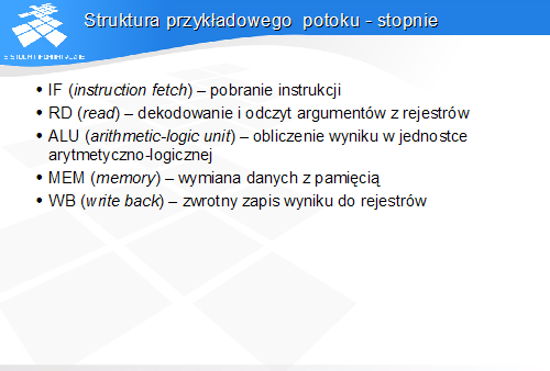 MEM (memory) -wymiana danych z pamięcią WB (write back) - zwrotny zapis wyniku do rejestrów