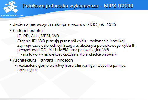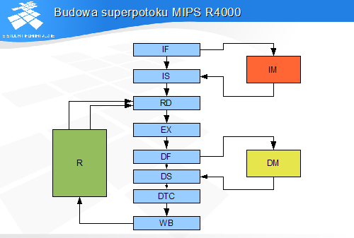 Diagram ilustruje wykonanie instrukcji przez potok procesora MIPS R3000. W każdym cyklu procesor rozpoczyna wykonanie nowej instrukcji i kończy wykonanie wcześniejszej instrukcji.