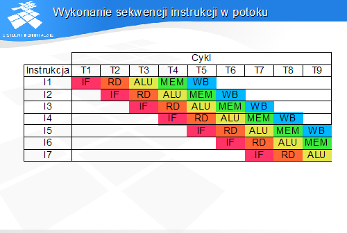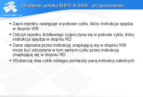 Podczas wykonania przedstawionej sekwencji instrukcji w potoku, druga instrukcja, znajdując się w stopniu RD odczytuje zawartość rejestru, który pierwsza instrukcja zaktualizuje w stopniu WB, a więc w trzy cykle później.