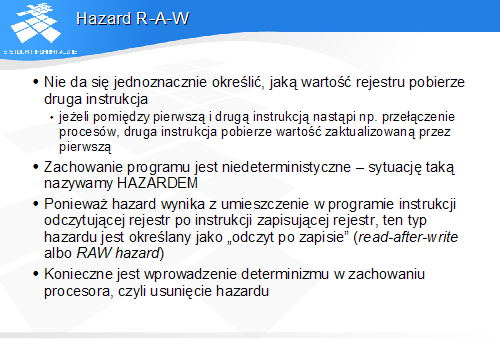 Ponieważ nie wiadomo, czy wykonanie programu zostanie zawieszone, a następnie wznowione pomiędzy instrukcją pierwszą i drugą – nie można jednoznacznie określić, jaką wartość rejestru $4 pobierze druga instrukcja. Sytuacja taka jest nazywana hazardem.