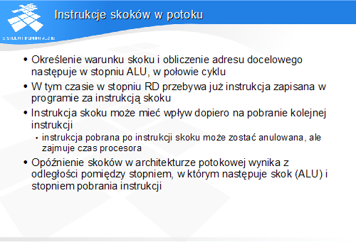 Podobny problem występuje w odniesieniu do instrukcji skoków. Skok jest realizowany w stopniu ALU, kiedy instrukcja następująca bezpośrednio po instrukcji skoku znajduje się już w stopniu RD. Zmiana PC dokonana w stopniu ALU wpływa natychmiast na działanie stopnia IF, który pobiera instrukcję spod adresu docelowego skoku. W potoku znalazła się jednak już jedna instrukcja za instrukcją skoku.