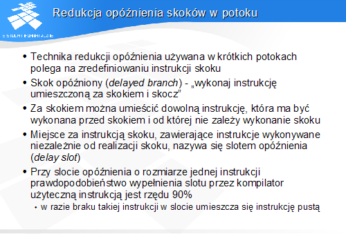 Z badań statystycznych wynika, że w większości przypadków daje się znaleźć w programie przed instrukcją skoku taką instrukcję, której wykonanie nie wpływa na wykonanie skoku. Instrukcja taka może zostać przez programistę lub kompilator przesunięta za instrukcję skoku.