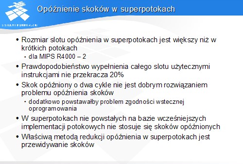 Architektury projektowane od razu z myślą o realizacji superpotokowej nie mają instrukcji skoku opóźnionego. Ze względu na duże opóźnienie skoków są one wyposażane w układy przyspieszające wykonanie skoków, omówione w oddzielnym module.
