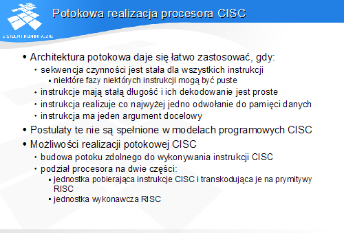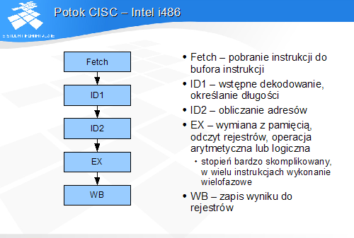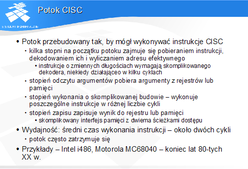 Modele programowe zgodne z założeniami koncepcji CISC nie pasują do koncepcji potoku, opracowanej równocześnie z koncepcją modelu programowego RISC. Aby procesory CISC mogły konkurować z procesorami RISC pod względem wydajności, konieczne stało się opracowanie potokowych realizacji procesorów CISC.