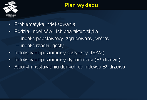Celem wykładu jest omówienie podstawowych koncepcji indeksowania danych i struktur indeksowych. W ramach wykładu zostaną omówione: