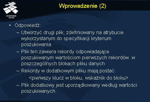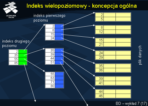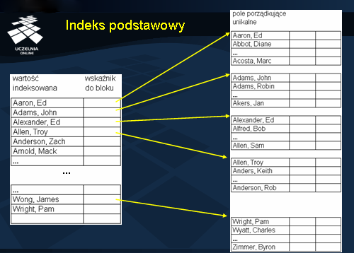 Poglądową strukturę indeksu podstawowego przedstawia slajd. Jak widać, wskazania z rekordów indeksowych prowadzą do bloków danych.