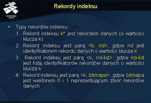 2. Rekord indeksu jest parą <k, rid>, gdzie rid jest identyfikatorem rekordu danych o wartości klucza k.