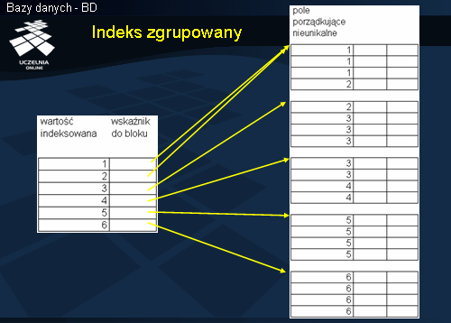 Indeks zgrupowany jest zakładany również na atrybucie porządkującym, ale w tym przypadku jego wartości nie są unikalne.