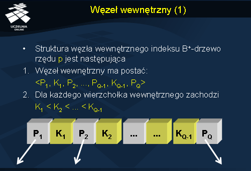 1. Węzeł wewnętrzny ma następującą postać: wskaźnik do węzła, wartość klucza indeksu, kolejny wskaźnik, kolejna wartość, itd. Liczba wskaźników jest o jeden większa od liczby wartości klucza.