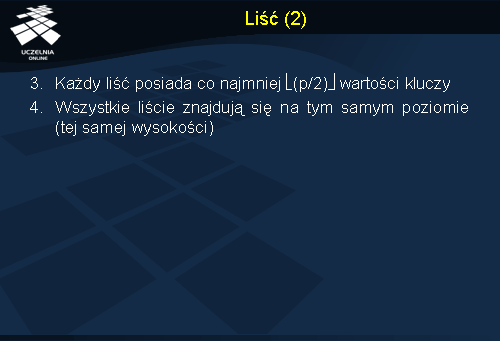 5. Dla każdego wierzchołka wewnętrznego liczba wskaźników do poddrzew jest określona jako najmniejsza liczba całkowita większa lub równa połowie rzędu drzewa. Korzeń posiada co najmniej 2 wskaźniki do poddrzew.