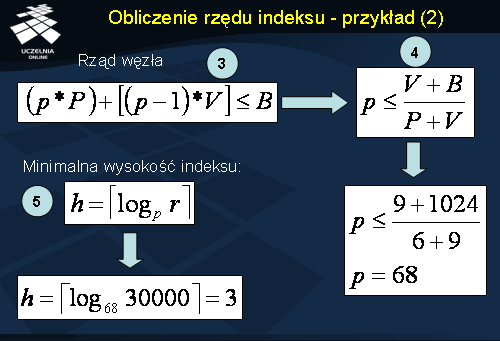 Rząd węzła obliczamy przekształcając wzór 3 ze slajdu do wzoru 4. Po podstawieniu wartości do wzoru 4 otrzymujemy wynik: rząd węzła wewnętrznego p=68. Z wykorzystaniem obliczonej wartości rzędu węzła możemy następnie obliczyć minimalną wysokość indeksu niezbędną do poindeksowania 30000 rekordów danych. Wykorzystujemy do tego celu wzór 5. Po podstawieniu danych, otrzymujemy wynik - indeks musi mieć przynajmniej 3 poziomy.