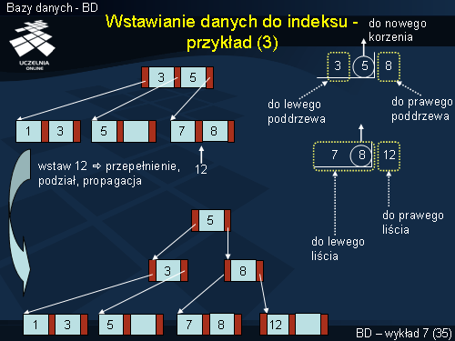 Wartość 3 musi być wstawiona do lewego liścia. Jednak jest on już w całości zajęty. Z tego powodu węzeł jest rozbijany na 2. W tym celu porządkujemy wartości istniejące w węźle i wartość wstawianą, od lewej (najmniejsza) do prawej (największa). Wartość środkową, czyli 3, przenosimy do korzenia. Wartości 1 i 3 trafiają do lewego liścia, a 5 - do prawego, jak pokazano na slajdzie.