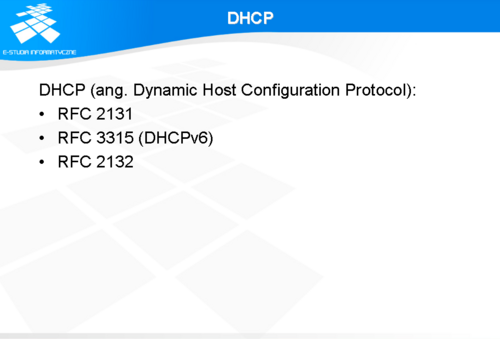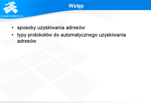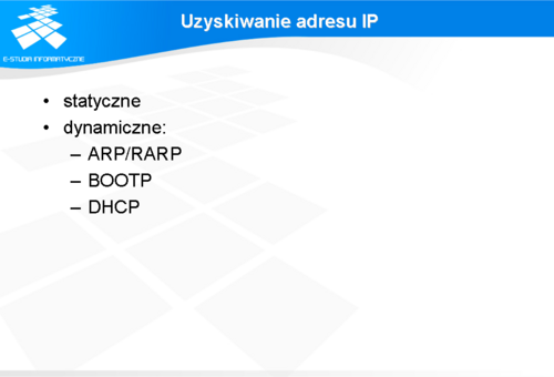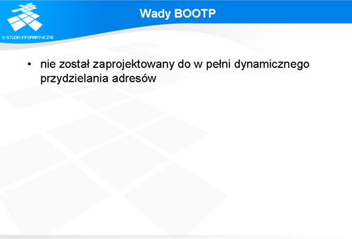 Lepszym rozwiązaniem jest przydzielanie adresów IP w sposób dynamiczny. Wśród wielu protokołów, które są do tego celu używane można wyróżnić: ARP/RARP BOOTP DHCP Protokoły te zostaną omówione dokładniej na następnych slajdach.