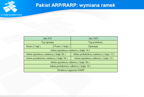 Poszczególne pola pakietu mają następujące znaczenie: Typ sprzętu - 2B - określa typ interfejsu sieciowego stosowanego przez nadawcę. W przypadku interfejsu Internet wpisana jest tam wartość 1. Typ protokołu - 2B - podaje typ protokołu, który wysłał żądanie (odpowiedź). W przypadku protokołu IP wpisana jest tam wartość 0x0800. HLen - 1B - Długość adresu sprzętowego, w przypadku protokołu Ethernet 48 bitów. PLen - 1B - długość adresu protokołu warstwy sieciowej (L3), który został wyspecyfikowany w polu Typ protokołu. W przypadku IPv4 32 bity.