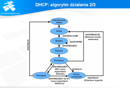 Klient wysyła komunikat DHCPDISCOVER Serwer(y) odpowiadają komunikatem DHCPOFFER Klient po wybraniu oferty wysyła komunikat DHCPREQUEST Serwer potwierdza wysyłając komunikat DHCPACK