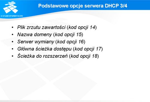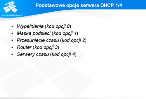 Maska podsieci (kod opcji 1) — przedstawia maskę podsieci dla danej podsieci fizycznej. Przesunięcie czasu (kod opcji 2) — oznacza czas UCT (Universal Coordinated Time) w sekundach. Router (kod opcji 3) — wymienia adresy IP wszystkich routerów dostępnych w podsieci. Serwery czasu (kod opcji 4) — wymienia adresy IP wszystkich serwerów czasu dostępnych dla klienta.