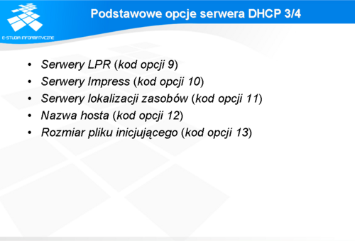 Serwery DNS (kod opcji 6) — wymienia adresy IP wszystkich serwerów DNS dostępnych dla klienta. Serwery dziennika (kod opcji 7) — wymienia adresy IP wszystkich serwerów dziennika dostępnych dla klienta. Serwery cookie (kod opcji 8) — wymienia adresy IP wszystkich serwerów cookie dostępnych dla klienta. Serwery LPR (kod opcji 9) — wymienia adresy IP wszystkich serwerów drukarek wierszowych (Line PRinter) dostępnych dla klienta.
