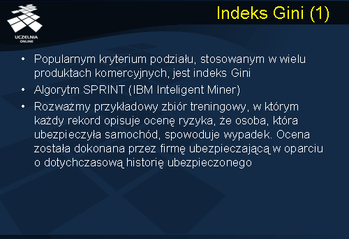 Jak zostało omówione wcześniej, jednym z newralgicznych punktów budowy drzewa decyzyjnego, jest wybór punktu podziału, który najlepiej wyznacza wierzchołek wewnętrzny drzewa decyzyjnego, innymi słowy „najlepiej” dzieli zbiór danych treningowych należących do tego wierzchołka. Popularnym kryterium oceny punktu podziału, stosowanym w wielu produktach komercyjnych, jest indeks Gini. Wykorzystuje się go między innymi w komercyjnym systemie IBM Inteligent Miner, w którym został zaimplementowany algorytm SPRINT. Rozważmy przykładowy zbiór treningowy, w którym każdy rekord opisuje ocenę ryzyka, że osoba, która ubezpieczyła samochód, spowoduje wypadek. Ocena została dokonana przez firmę ubezpieczeniową w oparciu o dotychczasową historię ubezpieczonego.