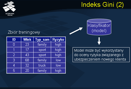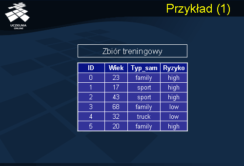 Dany jest zbiór treningowy przedstawiony na slajdzie. Zbiór treningowy zawiera dane opisujące ubezpieczonych, są to: identyfikator klienta, wiek ubezpieczonego, Typ_samochodu oznaczający typ posiadanego przez ubezpieczonego samochodu, oraz atrybut decyzyjny Ryzyko, określający czy ubezpieczony jest potencjalnym zagrożeniem na drodze, czy też poprawnym kierowcą bezwypadkowym. W oparciu o zbiór treningowy algorytm klasyfikacyjny konstruuje model (klasyfikator), który może być wykorzystany do oceny ryzyka związanego z ubezpieczeniem nowego klienta.