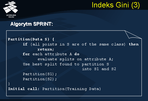 Przykładem algorytmu klasyfikacyjnego, który wykorzystuje mechanizm indukcji drzew decyzyjnych, który konstruuje binarne drzewo decyzyjne, który do oceny punktów podziału wykorzystuje indeks gini jest algorytm SPRINT. Algorytm SPRINT, jak już wspominaliśmy jest wykorzystywany w znanym i popularnym produkcie komercyjnym IBM Intelligent Miner. Konstrukcja drzewa decyzyjnego zgodnie z algorytmem SPRINT przebiega w następujący sposób: Podstawową procedurą tego algorytmu jest procedura Partition, której argumentem jest zbiór danych S. Jeżeli wszystkie próbki ze zbioru treningowego S należą do tej samej klasy, wówczas algorytm kończy działanie. Tworzy wierzchołek liścia i jego etykietą jest klasa, do której należą wszystkie obiekty należące do zbioru S. W przeciwnym wypadku algorytm, dla każdego atrybutu A analizuje wszystkie możliwe punkty podziału dla tego atrybutu. Następnie wybiera najlepszy punkt podziału spośród wszystkich możliwych punktów podziału dla wszystkich atrybutów. Wybieramy najlepszy punkt podziału i punkt ten dzieli nam zbiór S na partycje S1 i S2. Następnie wywoływana jest procedura Partition dla zbioru S1 i dla zbioru S2. Procedura jest wykonywana tak długo, aż każda z partycji zawiera dane należące wyłącznie do jednej klasy lub gdy liczba elementów partycji dostatecznie mała (spada poniżej pewnego zadanego progu).