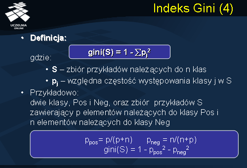 Zanim przedstawimy szczegółowo mechanizm konstrukcji binarnego drzewa decyzyjnego zgodnie z algorytmem SPRINT, wprowadzimy dodatkowo dwie niezbędne definicje. Definicja 1 wartości indeksu gini dla zbioru S. Niech S oznacza zbiór przykładów należących do n klas. W danym węźle pj określa względną częstość występowania klasy j w zbiorze S. Wówczas wartość indeksu gini dla zbioru S jest równa różnicy przedstawionej na slajdzie. Przykładowo, jeżeli założymy, że zbiór S zawiera tylko i wyłącznie dwie klasy oznaczone Pos (pozytywne) i Neg (negatywne). Zakładamy, że mamy p elementów należących do klasy Pos i n elementów należących do klasy Neg, wówczas względna częstość występowania klasy Pos w zbiorze S wynosi p/(p+n). Natomiast względna częstość występowania klasy Neg w zbiorze S wynosi n/(n+p). Wartość indeksu gini dla zbioru S jest równa 1 - Ppos^2 - Pneg^2.